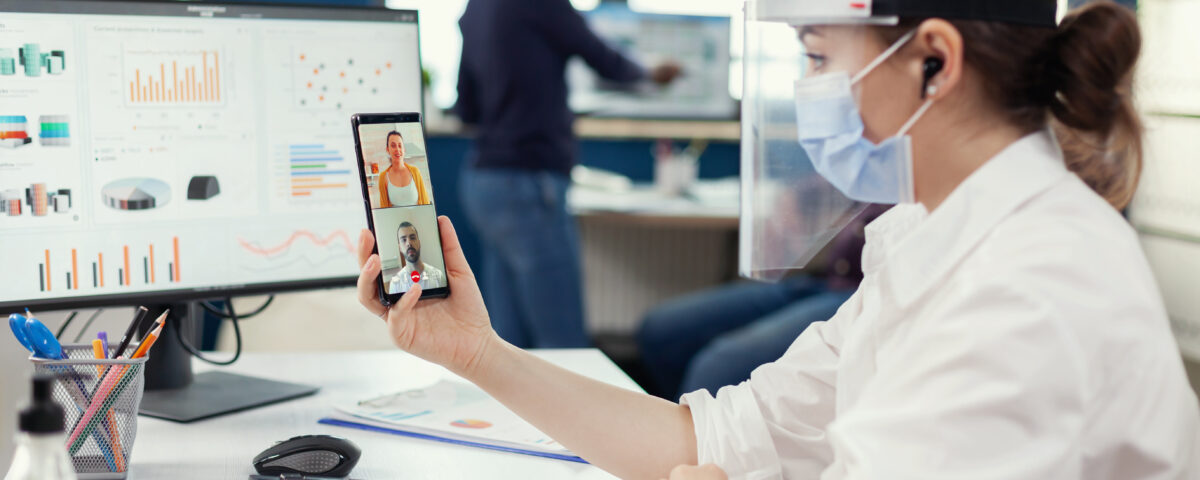 Young woman drinking coffee and analyzing financial displayed on computer screen in startup office. Female analyst holds cup with warm beverage, examining company research data on desktop pc.